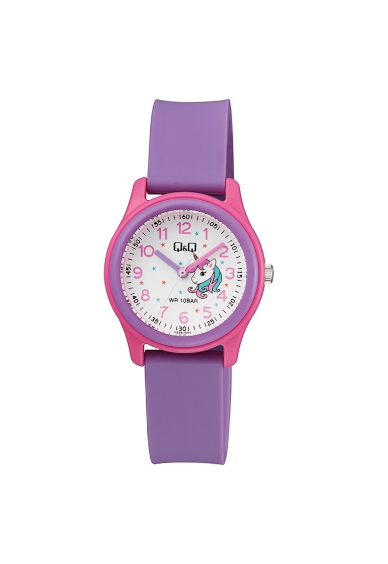 Caracteristici Mecanism: quartz Rezistenta la apa: 10 atm Stil: casual Afisaj: analogic Carcasa: rotunda Culoare carcasa: roz Functii: minut Tip citire cadran: cifre arabe Culoare curea/bratara: mov Sistem inchidere: catarama Compozitie Material carcasa: plastic Material curea/bratara: cauciuc Material geam: acrilic Dimensiuni Diametru carcasa: 32 mm Latime curea/bratara: 16 mm