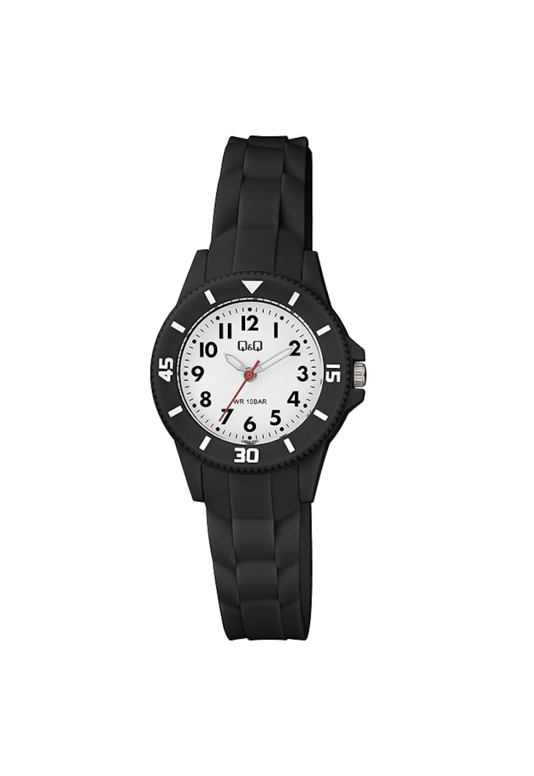 Caracteristici Mecanism: quartz Rezistenta la apa: 10 atm Stil: sport Afisaj: analogic Carcasa: rotunda Culoare carcasa: negru Functii: minut Finisaj carcasa: mat Tip citire cadran: cifre arabe Culoare curea/bratara: negru Sistem inchidere: clasic Compozitie Material carcasa: plastic Material curea/bratara: silicon Material geam: acrilic Finisaj curea/bratara: mat Dimensiuni Diametru carcasa: 30 mm