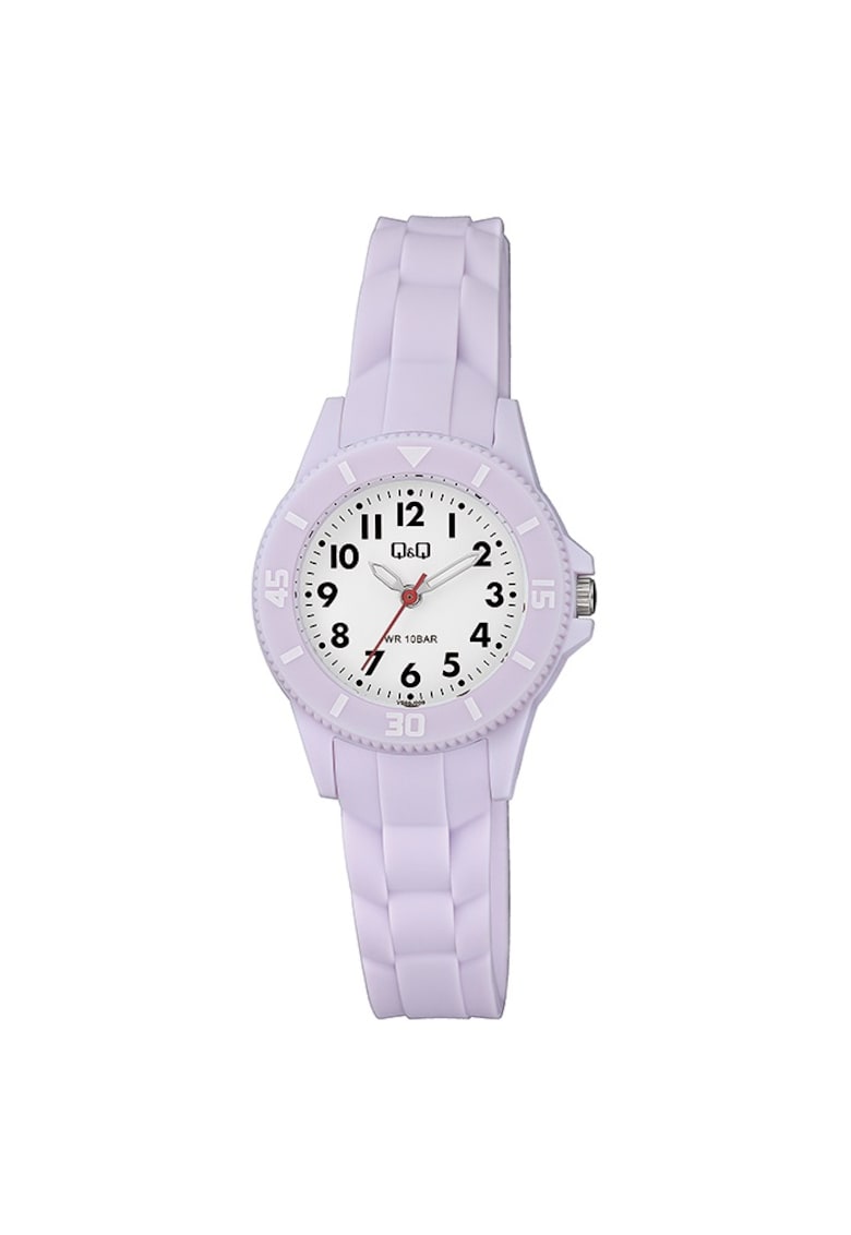 Caracteristici Mecanism: quartz Rezistenta la apa: 10 atm Stil: sport Afisaj: analogic Carcasa: rotunda Culoare carcasa: roz Functii: minut Finisaj carcasa: mat Tip citire cadran: cifre arabe Culoare curea/bratara: mov (deschis) Sistem inchidere: clasic Compozitie Material carcasa: plastic Material curea/bratara: silicon Material geam: acrilic Finisaj curea/bratara: mat Dimensiuni Diametru carcasa: 30 mm