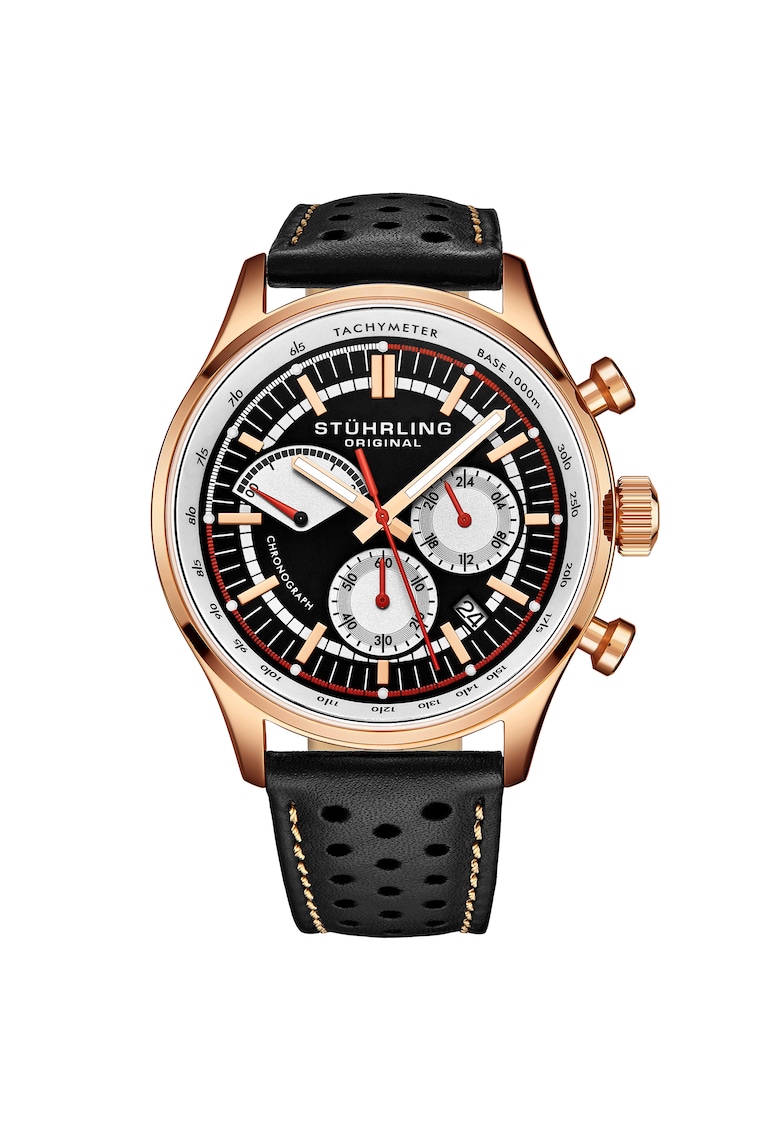 - tahimetru Rezistenta la apa: 5 atm Cadran Material geam: cristal mineral Culoare cadran: negru Carcasa Forma carcasa: rotunda Material carcasa: inox Culoare carcasa: auriu rose Diametru carcasa: 42 mm Curea/bratara Tip: curea Material curea/bratara: piele naturala Culoare curea/bratara: negru