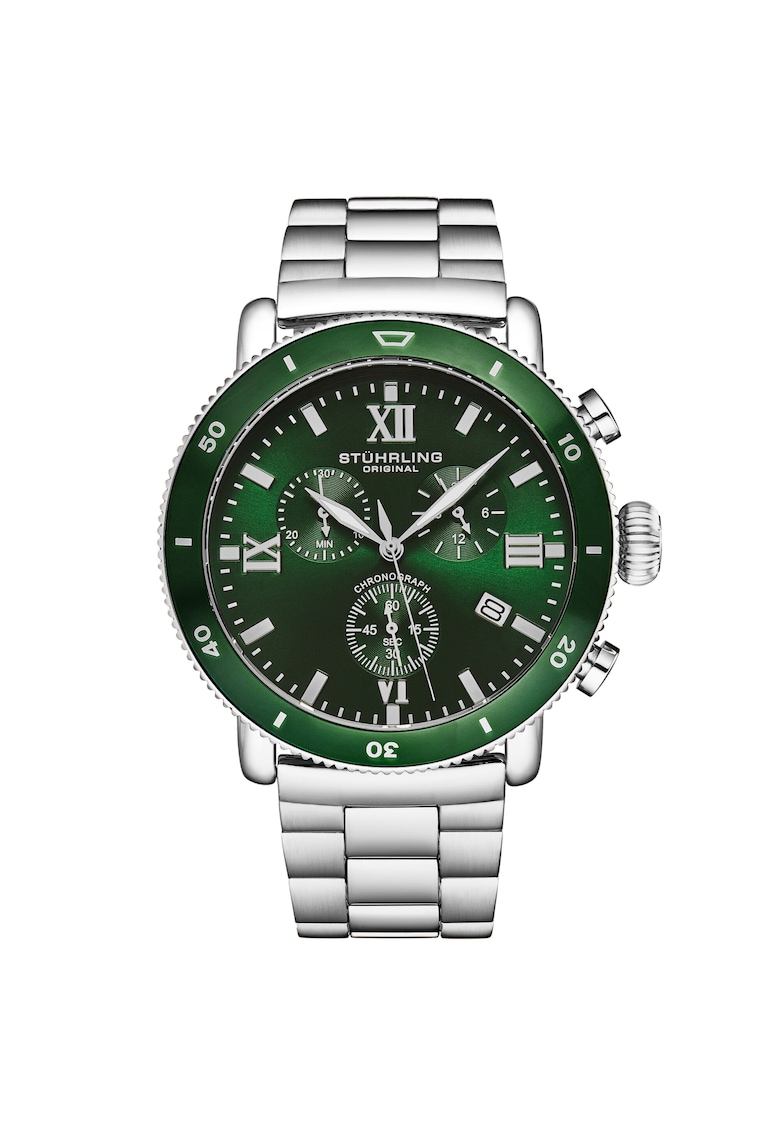 - cronograf Rezistenta la apa: 10 atm Cadran Material geam: cristal mineral Culoare cadran: verde Tip citire cadran: cifre romane Carcasa Forma carcasa: rotunda Material carcasa: aliaj Culoare carcasa: argintiu Diametru carcasa: 48 mm Curea/bratara Tip: bratara Material curea/bratara: inox Culoare curea/bratara: argintiu