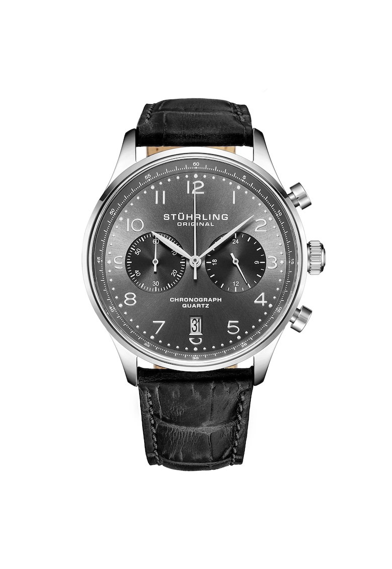 - cronograf Rezistenta la apa: 5 atm Cadran Material geam: cristal mineral Tip citire cadran: cifre arabe Carcasa Forma carcasa: rotunda Material carcasa: aliaj Culoare carcasa: argintiu Diametru carcasa: 42 mm Curea/bratara Tip: curea Material curea/bratara: piele naturala Culoare curea/bratara: negru