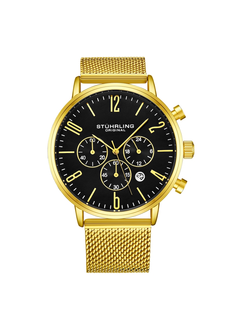 - cronometru Rezistenta la apa: 3 atm Cadran Material geam: cristal mineral Culoare cadran: negru Carcasa Forma carcasa: rotunda Material carcasa: inox Culoare carcasa: auriu Diametru carcasa: 41 mm Curea/bratara Tip: plasa Material curea/bratara: inox Culoare curea/bratara: auriu