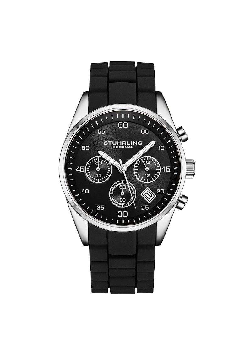 - cronograf Rezistenta la apa: 3 atm Cadran Material geam: cristal mineral Tip citire cadran: cifre arabe Carcasa Forma carcasa: rotunda Material carcasa: aliaj Culoare carcasa: argintiu Curea/bratara Tip: curea Material curea/bratara: silicon Culoare curea/bratara: negru