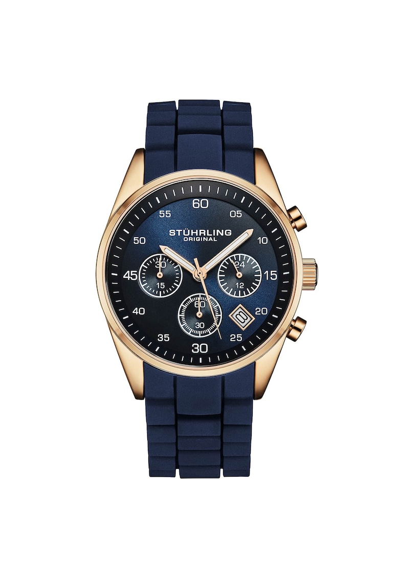 - cronograf Rezistenta la apa: 3 atm Cadran Material geam: cristal mineral Tip citire cadran: cifre arabe Carcasa Forma carcasa: rotunda Material carcasa: aliaj Culoare carcasa: auriu rose Curea/bratara Tip: curea Material curea/bratara: silicon Culoare curea/bratara: bleumarin