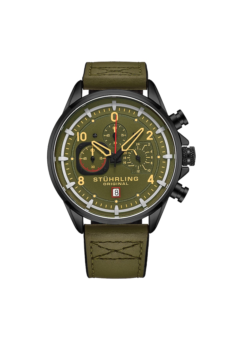 - tahimetru Rezistenta la apa: 5 atm Cadran Material geam: cristal mineral Culoare cadran: verde Carcasa Forma carcasa: rotunda Material carcasa: inox Culoare carcasa: negru Diametru carcasa: 45 mm Curea/bratara Tip: curea Material curea/bratara: piele naturala Culoare curea/bratara: kaki