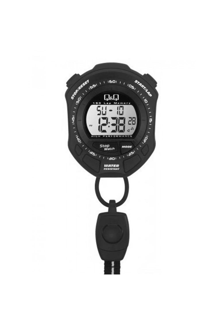 Caracteristici generale Tip mecanism: quartz Stil: sport Tip display: digital Functii: cronometru Rezistenta la apa: 5 atm Cadran Material geam: plastic Culoare cadran: gri Tip citire cadran: cifre arabe Carcasa Forma carcasa: dreptunghiulara Material carcasa: plastic Culoare carcasa: negru Diametru carcasa: 65 mm Curea/bratara Tip: plasa Material curea/bratara: textil Culoare curea/bratara: negru