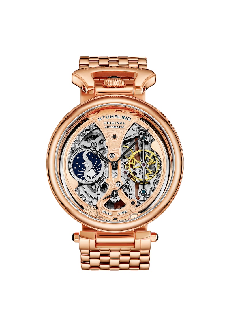 - dual time Rezistenta la apa: 5 atm Cadran Material geam: cristal mineral Tip citire cadran: fara indici Carcasa Forma carcasa: rotunda Material carcasa: inox Culoare carcasa: auriu rose Diametru carcasa: 46 mm Curea/bratara Tip: bratara Material curea/bratara: inox Culoare curea/bratara: auriu rose