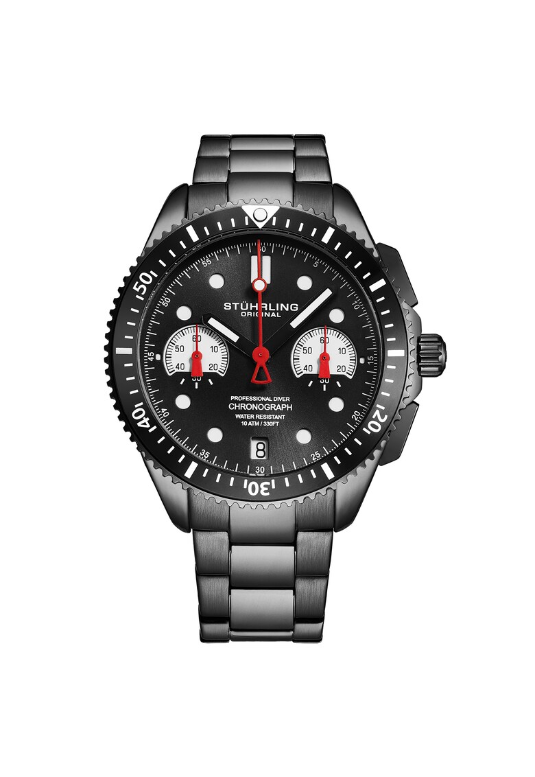 - cronograf Rezistenta la apa: 10 atm Cadran Material geam: cristal mineral Tip citire cadran: puncte Carcasa Forma carcasa: rotunda Material carcasa: aliaj Culoare carcasa: negru Curea/bratara Tip: bratara Material curea/bratara: inox Culoare curea/bratara: negru
