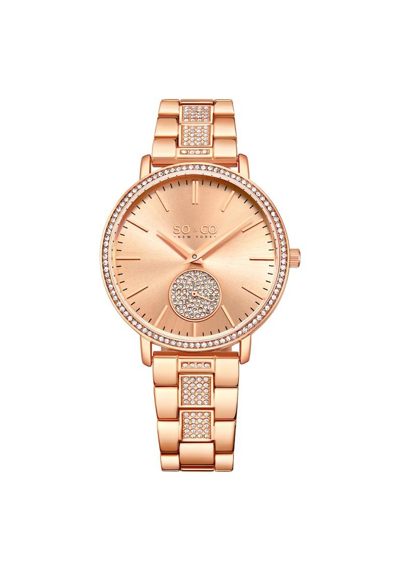 - secunda Rezistenta la apa: 3 atm Cadran Material geam: cristal mineral Culoare cadran: auriu rose Tip citire cadran: fara indici Carcasa Forma carcasa: rotunda Material carcasa: aliaj Culoare carcasa: auriu rose Diametru carcasa: 38 mm Curea/bratara Tip: bratara Material curea/bratara: inox Culoare curea/bratara: auriu rose