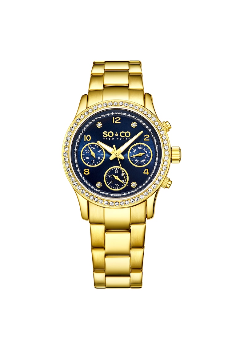 - afisare 24 h Rezistenta la apa: 5 atm Cadran Material geam: cristal mineral Culoare cadran: bleumarin inchis Carcasa Forma carcasa: rotunda Material carcasa: aliaj Culoare carcasa: auriu Diametru carcasa: 38 mm Curea/bratara Tip: bratara Material curea/bratara: inox Culoare curea/bratara: auriu
