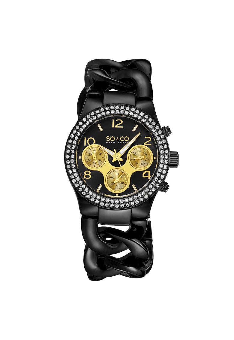 - auriu Tip citire cadran: cifre arabe Carcasa Forma carcasa: rotunda Material carcasa: aliaj Culoare carcasa: negru Diametru carcasa: 38 mm Curea/bratara Tip: bratara Material curea/bratara: inox Culoare curea/bratara: negru