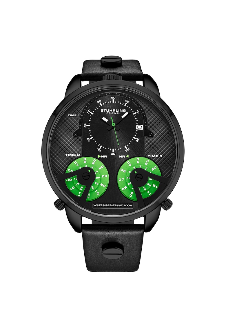 - mai multe fuse orare Rezistenta la apa: 10 atm Cadran Material geam: cristal mineral Tip citire cadran: cifre arabe Carcasa Forma carcasa: rotunda Material carcasa: aliaj Culoare carcasa: negru Diametru carcasa: 50 mm Curea/bratara Tip: curea Material curea/bratara: piele naturala Culoare curea/bratara: negru