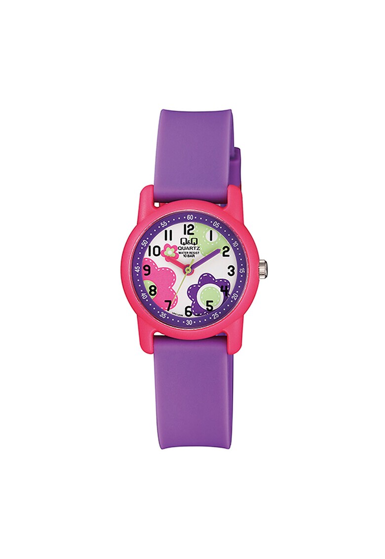 - minut Culoare curea/bratara: violet ametist Compozitie Material carcasa: abs Material curea/bratara: plastic Material geam: cristal mineral Dimensiuni Diametru carcasa: 39 mm