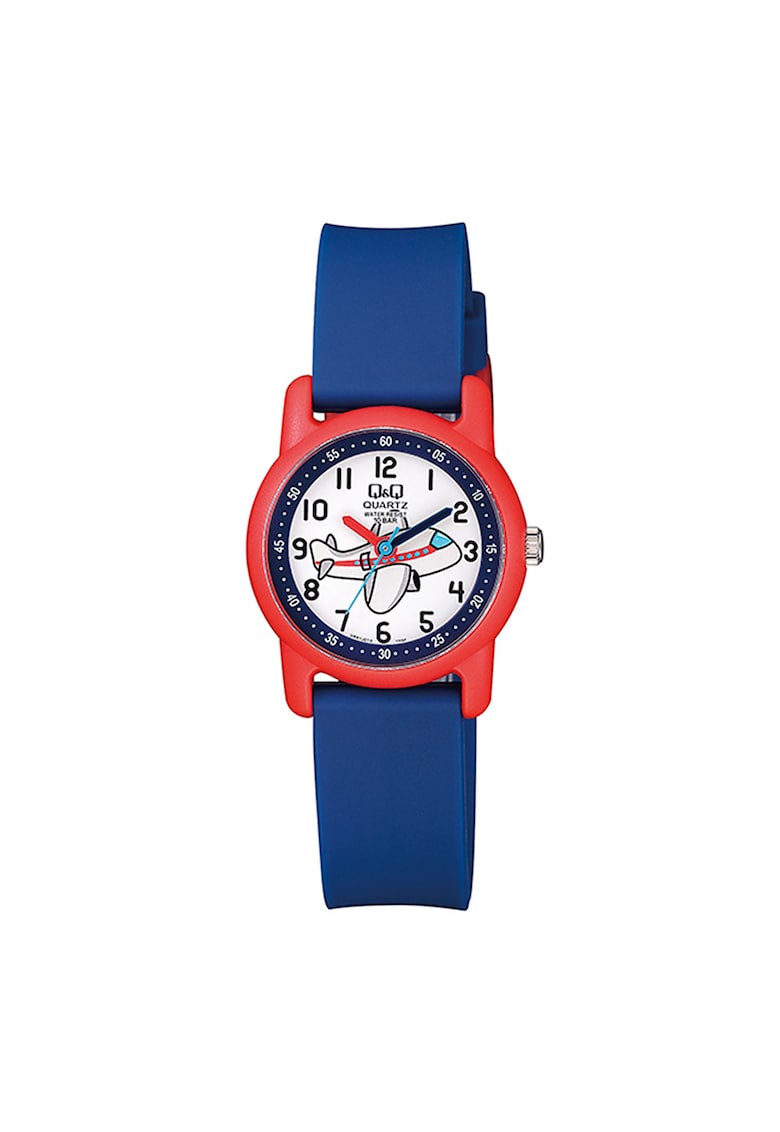 - minut Culoare curea/bratara: albastru inchis/rosu Compozitie Material carcasa: abs Material curea/bratara: plastic Material geam: cristal mineral Dimensiuni Diametru carcasa: 39 mm