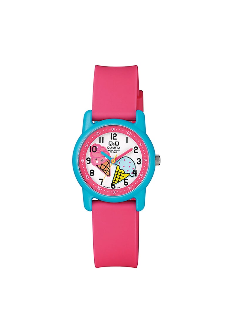 - minut Culoare curea/bratara: roz/albastru deschis Compozitie Material carcasa: abs Material curea/bratara: plastic Material geam: cristal mineral Dimensiuni Diametru carcasa: 39 mm