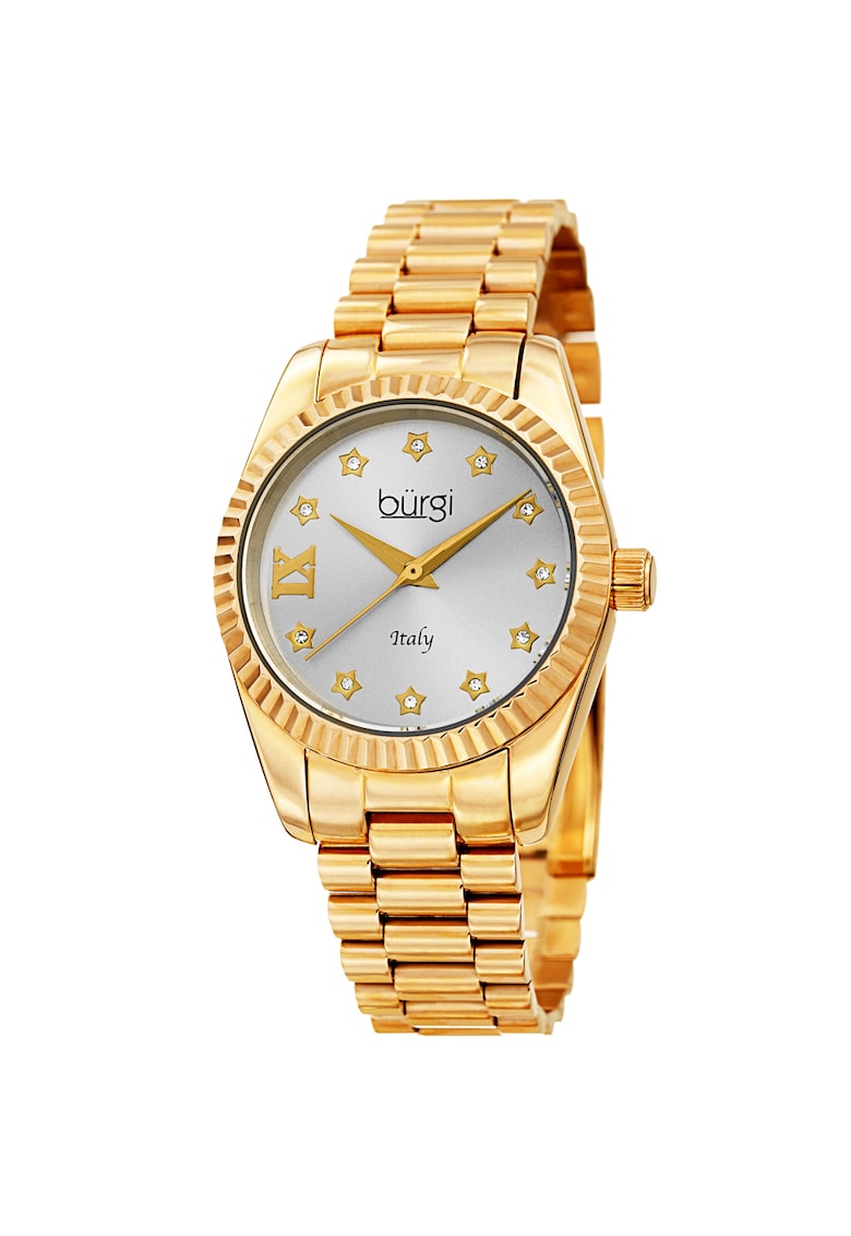 - secunda Rezistenta la apa: 3 atm Detalii: decorati cu cristale Cadran Material geam: cristal mineral Culoare cadran: argintiu Carcasa Forma carcasa: rotunda Material carcasa: aliaj Culoare carcasa: auriu Diametru carcasa: 31 mm Curea/bratara Tip: bratara Material curea/bratara: inox Culoare curea/bratara: auriu Latime curea/bratara: 16 mm
