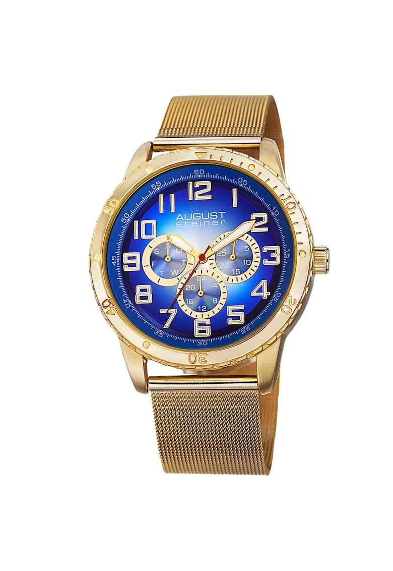 - afisare 24 h Cadran Material geam: cristal mineral Culoare cadran: albastru Tip citire cadran: cifre arabe Carcasa Forma carcasa: rotunda Material carcasa: aliaj Culoare carcasa: auriu Diametru carcasa: 38 mm Curea/bratara Tip: bratara Material curea/bratara: inox Culoare curea/bratara: auriu