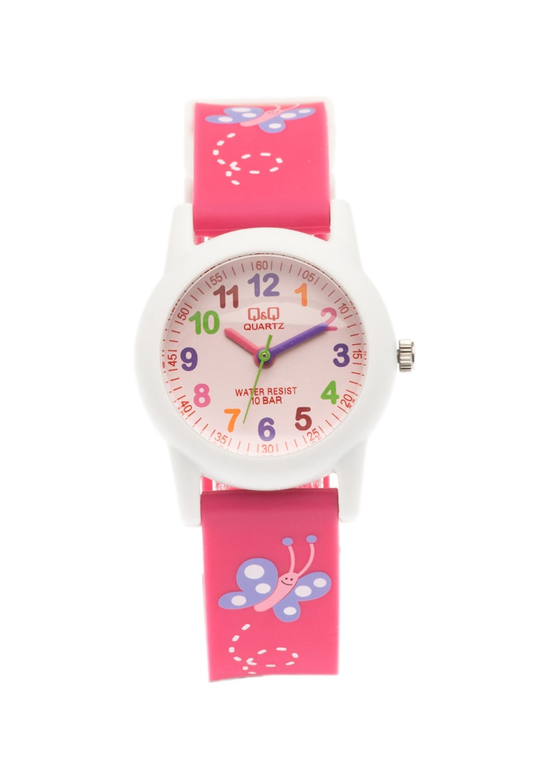 - minut Culoare curea/bratara: roz pal Compozitie Material carcasa: plastic Material curea/bratara: plastic Material geam: mineral Dimensiuni Diametru carcasa: 30 mm
