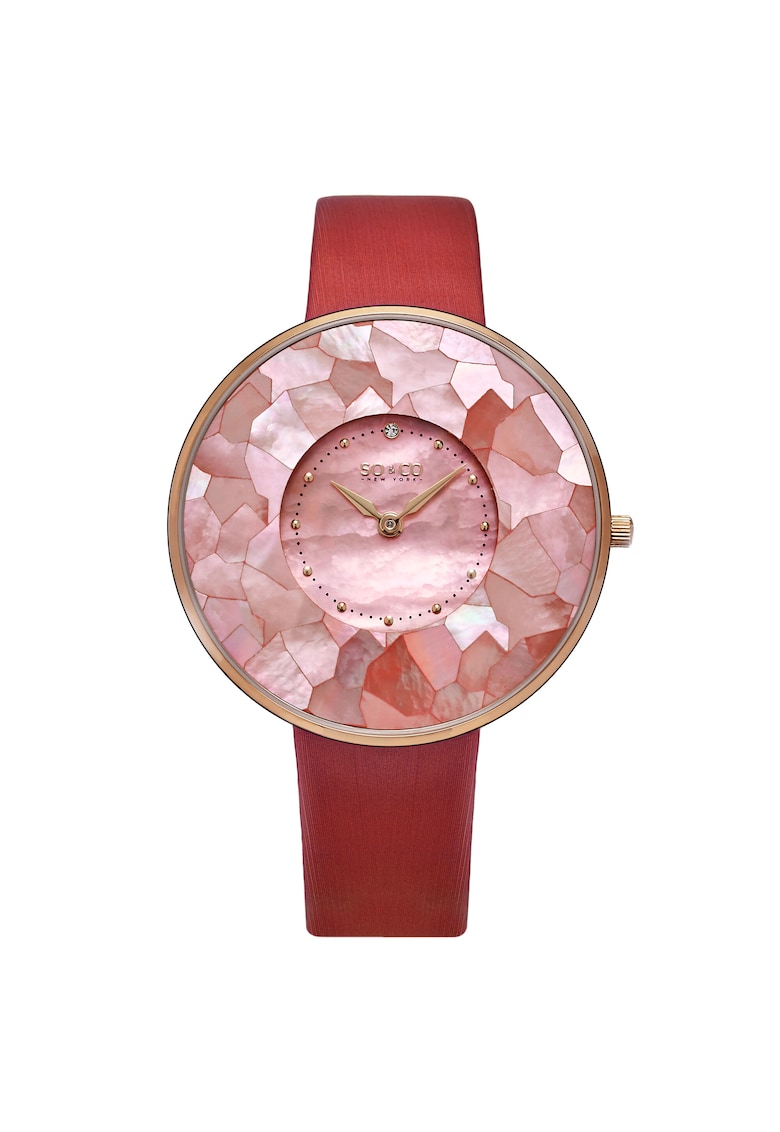 - minut Sistem inchidere: catarama Rezistenta la apa: 3 atm Cadran Material geam: cristal mineral Carcasa Forma carcasa: rotunda Material carcasa: aliaj Culoare carcasa: auriu rose Diametru carcasa: 38 mm Curea/bratara Tip: curea Material curea/bratara: piele naturala Culoare curea/bratara: rosu