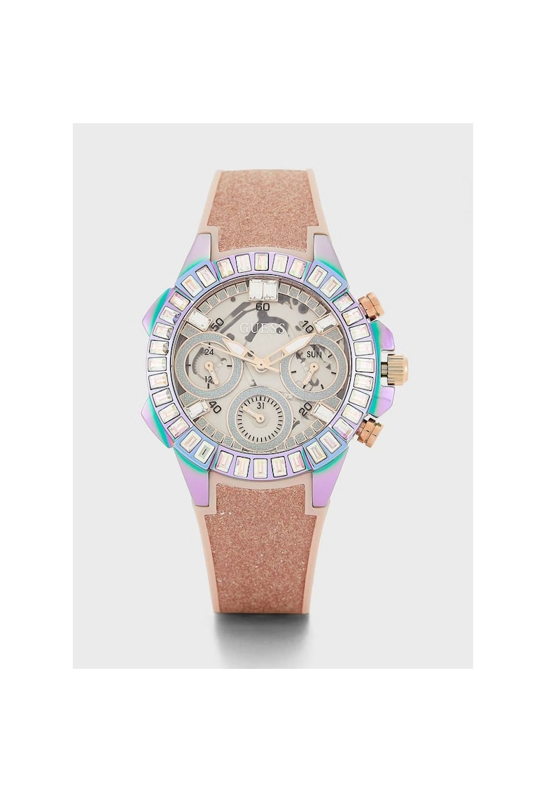 Caracteristici Tip mecanism: quartz Tip display: analog Stil: casual Functii: cronograf Rezistenta la apa: 5 atm Cadran Material geam: cristal mineral Culoare cadran: argintiu Tip citire cadran: linii Carcasa Forma carcasa: rotunda Material carcasa: inox Culoare carcasa: multicolor Diametru carcasa: 36 mm Curea/bratara Tip: curea Material curea/bratara: silicon Culoare curea/bratara: bej