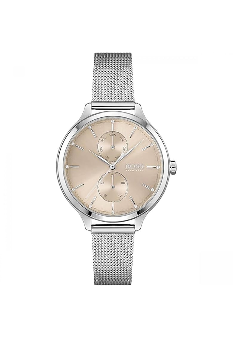 Caracteristici Tip mecanism: quartz Tip display: analog Stil: casual Functii: afisare data Rezistenta la apa: 3 atm Cadran Material geam: cristal mineral Culoare cadran: auriu Tip citire cadran: linii Carcasa Forma carcasa: rotunda Material carcasa: inox Culoare carcasa: argintiu Diametru carcasa: 36 mm Curea/bratara Tip: bratara Material curea/bratara: inox Culoare curea/bratara: argintiu