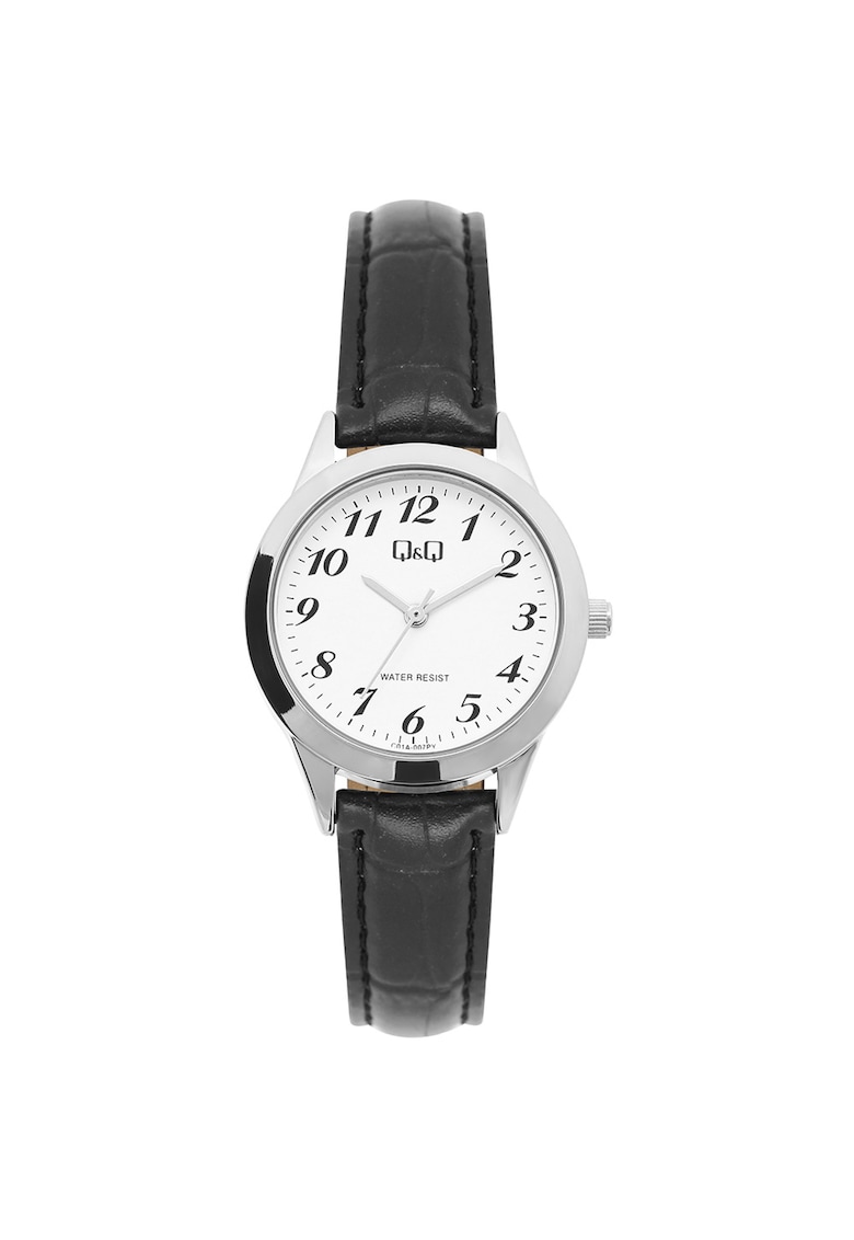 Caracteristici Tip mecanism: quartz Tip display: analog Stil: casual Functii: minut Rezistenta la apa: 3 atm Cadran Material geam: cristal mineral Culoare cadran: alb Tip citire cadran: cifre arabe Carcasa Forma carcasa: rotunda Material carcasa: inox Culoare carcasa: argintiu Diametru carcasa: 30 mm Curea/bratara Tip: curea Material curea/bratara: piele naturala Culoare curea/bratara: negru
