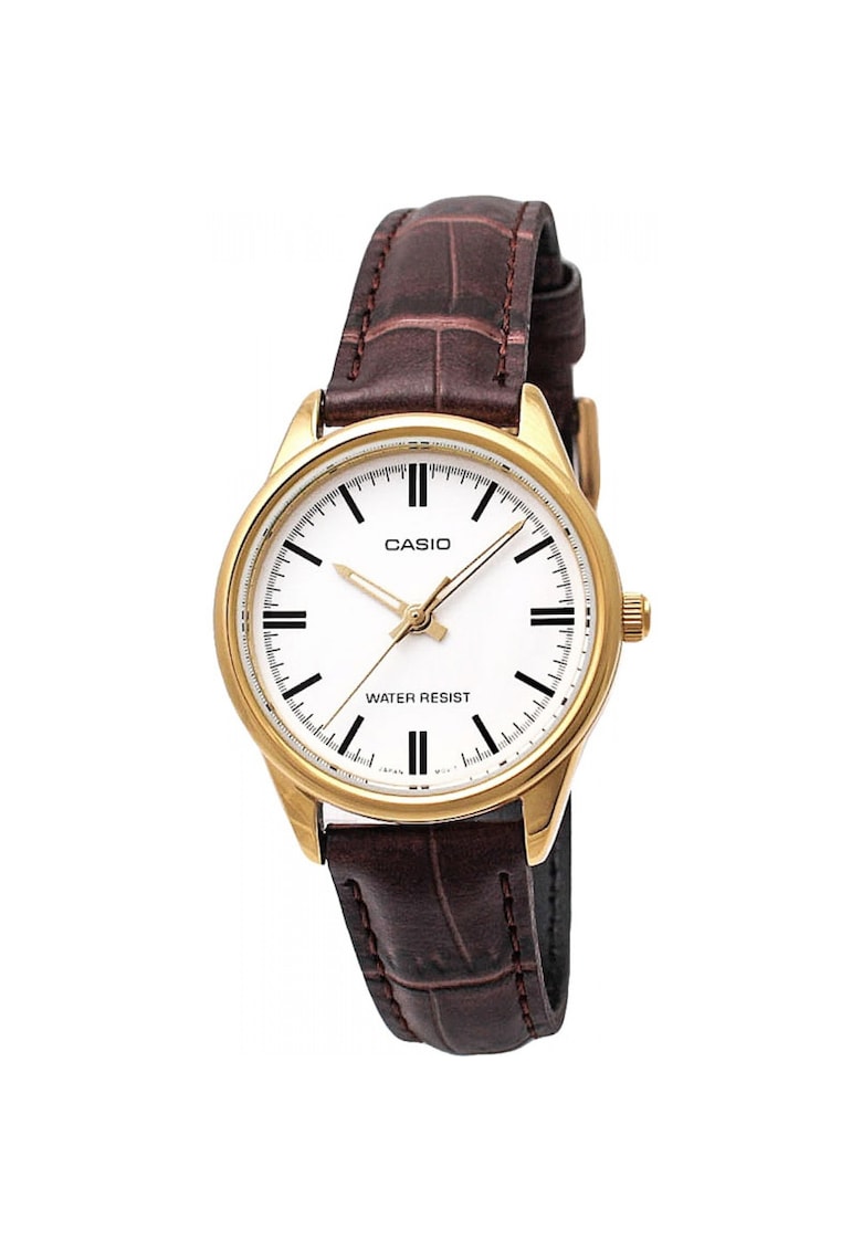 Caracteristici Tip mecanism: quartz Tip display: analog Stil: casual Functii: minut Rezistenta la apa: 3 atm Cadran Material geam: cristal mineral Culoare cadran: alb Tip citire cadran: linii Carcasa Forma carcasa: rotunda Material carcasa: inox Culoare carcasa: auriu Diametru carcasa: 28 mm Curea/bratara Tip: curea Material curea/bratara: piele naturala Culoare curea/bratara: maro