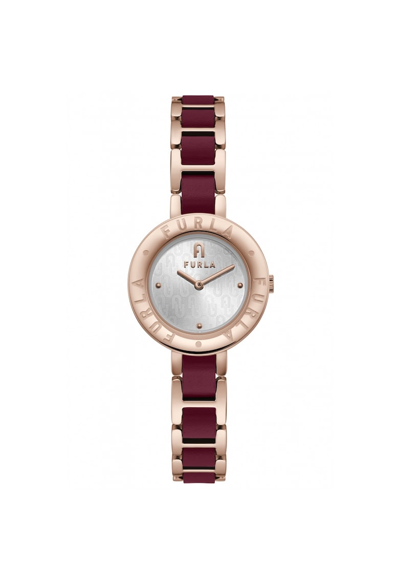 Caracteristici Tip mecanism: quartz Tip display: analog Stil: elegant Functii: minut Rezistenta la apa: 5 atm Cadran Material geam: cristal mineral Culoare cadran: argintiu Tip citire cadran: fara indici Carcasa Forma carcasa: rotunda Material carcasa: inox Culoare carcasa: auriu rose Diametru carcasa: 36 mm Curea/bratara Tip: bratara Material curea/bratara: inox Culoare curea/bratara: rosu bordeaux/auriu rose