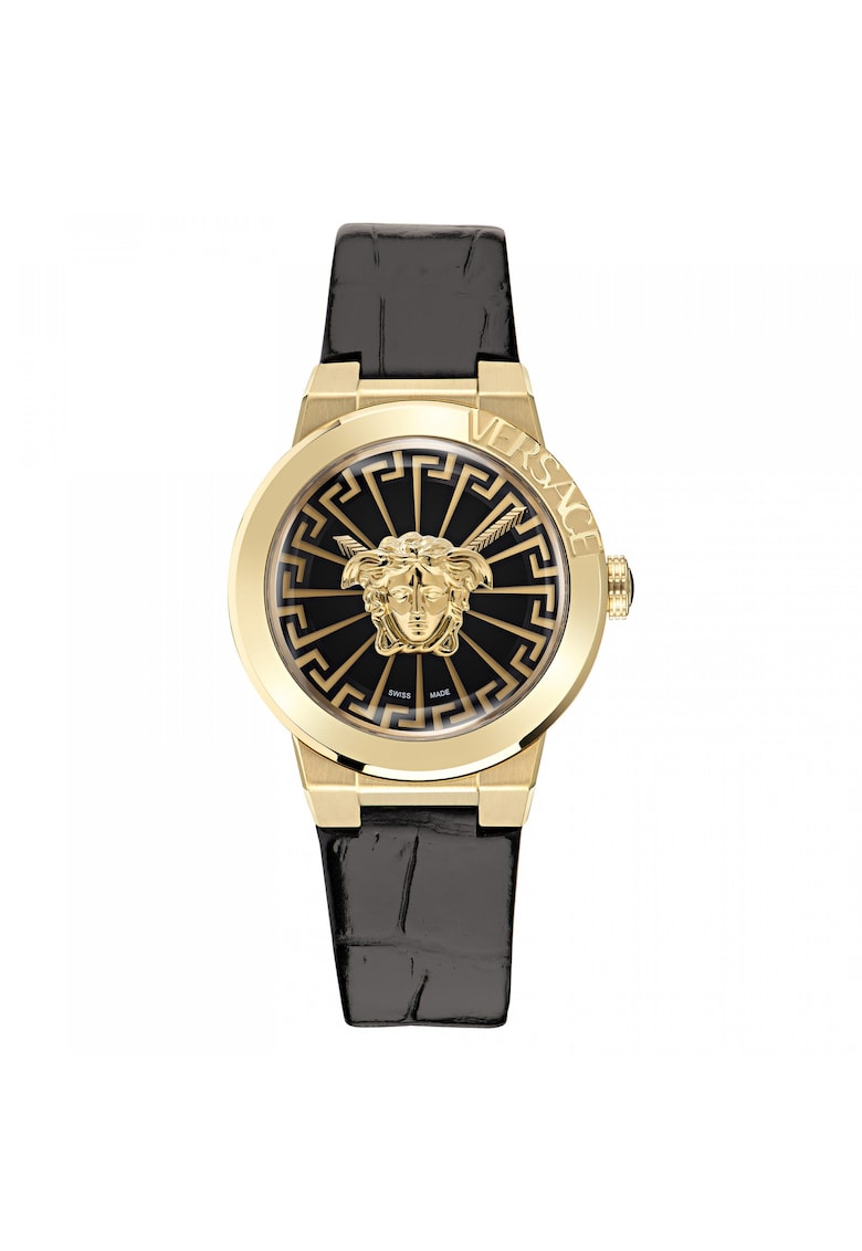 Caracteristici Tip mecanism: quartz Tip display: analog Stil: casual Functii: minut Rezistenta la apa: 5 atm Cadran Material geam: cristal safir Culoare cadran: negru Tip citire cadran: linii Carcasa Forma carcasa: rotunda Material carcasa: inox Culoare carcasa: auriu Diametru carcasa: 38 mm Curea/bratara Tip: curea Material curea/bratara: piele naturala Culoare curea/bratara: negru