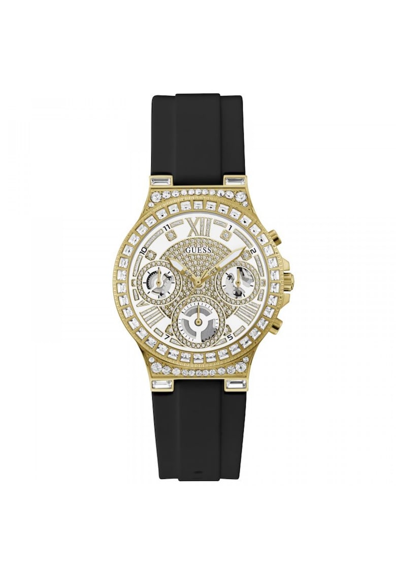 Caracteristici Tip mecanism: quartz Tip display: analog Stil: casual Functii: minut Rezistenta la apa: 3 atm Cadran Material geam: cristal mineral Culoare cadran: auriu Tip citire cadran: cifre romane Carcasa Forma carcasa: rotunda Material carcasa: inox Culoare carcasa: auriu Diametru carcasa: 36 mm Curea/bratara Tip: curea Material curea/bratara: silicon Culoare curea/bratara: negru