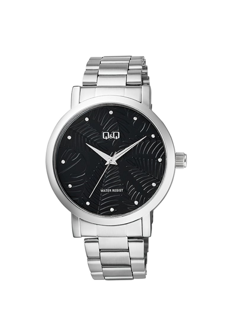 Caracteristici Tip mecanism: quartz Provenienta mecanism: japonia Tip display: analog Stil: elegant Functii: ora Rezistenta la apa: 3 atm Cadran Material geam: cristal mineral Culoare cadran: negru Tip citire cadran: puncte Carcasa Forma carcasa: rotunda Material carcasa: metal Culoare carcasa: argintiu Diametru carcasa: 42 mm Curea/bratara Tip: bratara Material curea/bratara: metal Culoare curea/bratara: argintiu