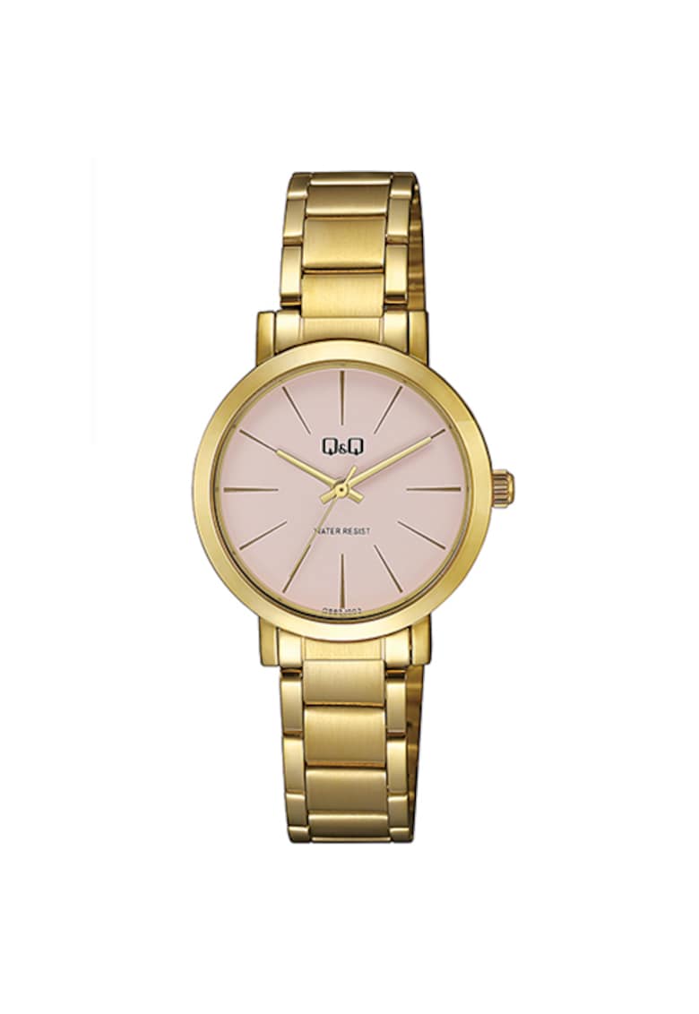 Caracteristici Tip mecanism: quartz Tip display: analog Stil: elegant Functii: ora Rezistenta la apa: 3 atm Cadran Material geam: cristal mineral Culoare cadran: roz Tip citire cadran: linii Carcasa Forma carcasa: rotunda Material carcasa: metal Culoare carcasa: auriu Diametru carcasa: 32 mm Curea/bratara Tip: bratara Material curea/bratara: metal Culoare curea/bratara: auriu