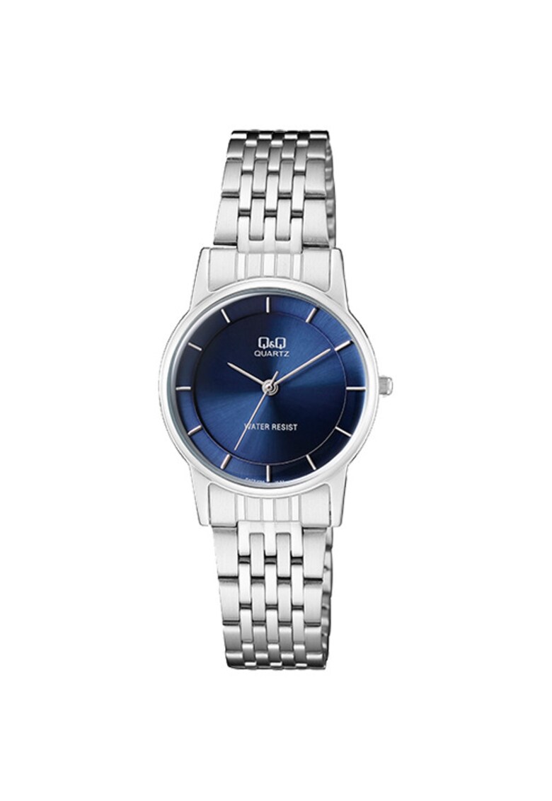 - secunda Rezistenta la apa: 3 atm Cadran Material geam: cristal mineral Culoare cadran: albastru Culoare indici: argintiu Tip citire cadran: linii Carcasa Forma carcasa: rotunda Culoare carcasa: argintiu Diametru carcasa: 30 mm Curea/bratara Tip: bratara Material curea/bratara: metal Culoare curea/bratara: argintiu