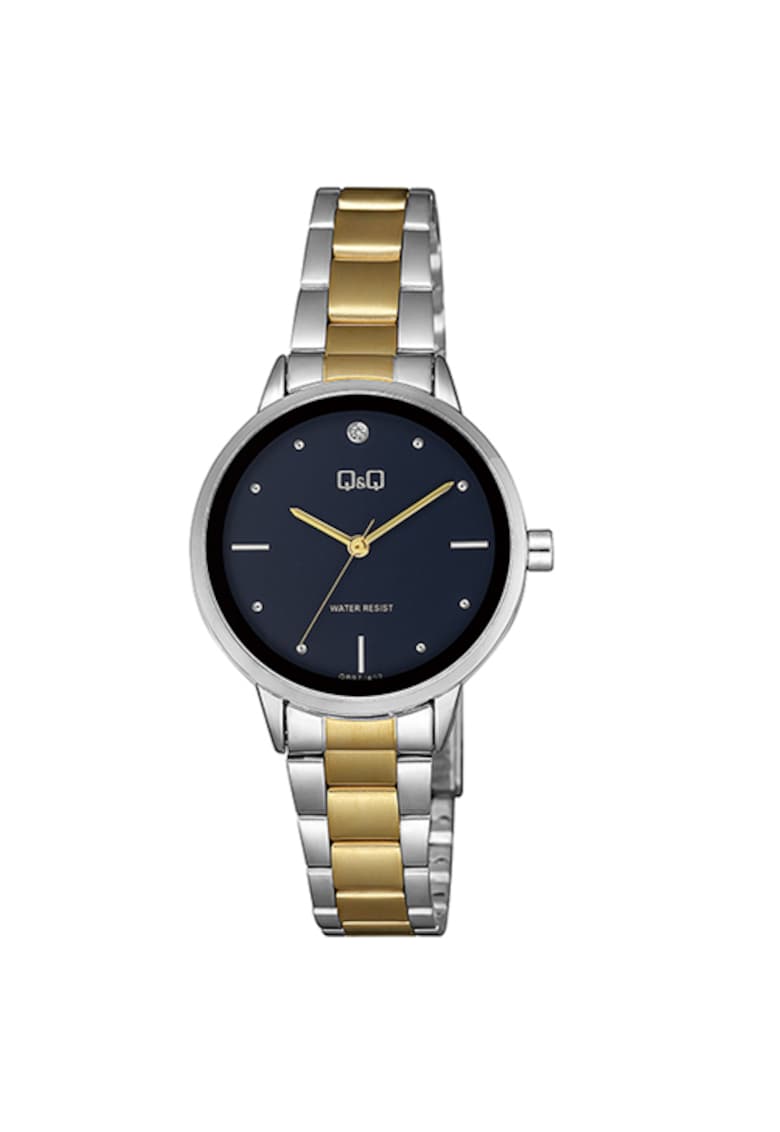 Caracteristici Tip mecanism: quartz Tip display: analog Stil: elegant Functii: ora Rezistenta la apa: 3 atm Cadran Material geam: cristal mineral Culoare cadran: negru Tip citire cadran: puncte Carcasa Forma carcasa: rotunda Material carcasa: metal Culoare carcasa: argintiu Diametru carcasa: 32 mm Curea/bratara Tip: bratara Material curea/bratara: metal Culoare curea/bratara: argintiu/auriu