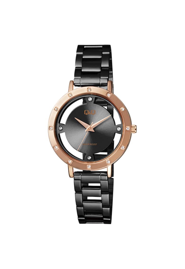 Caracteristici Tip mecanism: quartz Provenienta mecanism: japonia Tip display: analog Stil: elegant Functii: ora Rezistenta la apa: 3 atm Cadran Material geam: cristal mineral Culoare cadran: negru Tip citire cadran: puncte Carcasa Forma carcasa: rotunda Material carcasa: metal Culoare carcasa: auriu rose Diametru carcasa: 34 mm Curea/bratara Tip: bratara Material curea/bratara: metal Culoare curea/bratara: negru