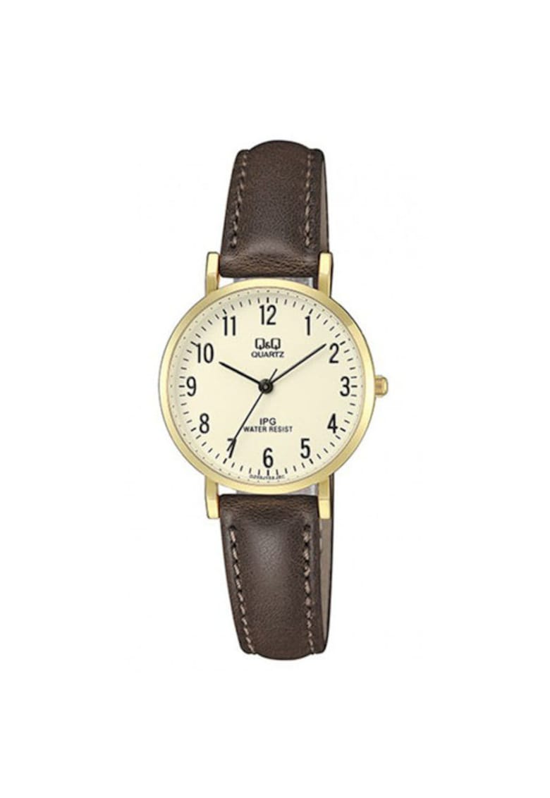 - secunda Sistem inchidere: catarama Rezistenta la apa: 3 atm Cadran Material geam: cristal mineral Culoare cadran: bej sampanie Tip citire cadran: cifre arabe Carcasa Forma carcasa: rotunda Material carcasa: metal Culoare carcasa: auriu Diametru carcasa: 31 mm Curea/bratara Tip: curea Material curea/bratara: piele ecologica Culoare curea/bratara: maro