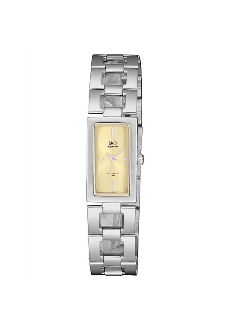 - secunda Rezistenta la apa: 5 atm Cadran Material geam: cristal mineral Culoare cadran: auriu Tip citire cadran: linii Carcasa Forma carcasa: dreptunghiulara Material carcasa: otel Culoare carcasa: argintiu Diametru carcasa: 16 mm Curea/bratara Tip: bratara Material curea/bratara: otel Culoare curea/bratara: argintiu