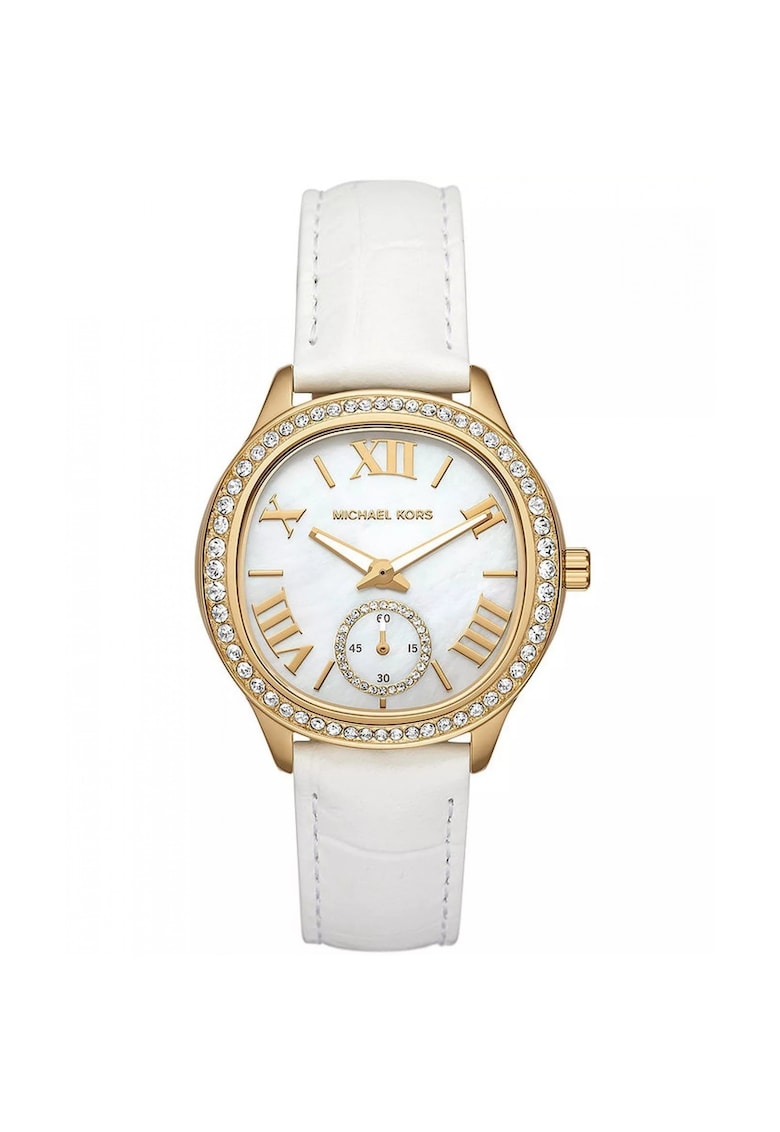Caracteristici Tip mecanism: quartz Tip display: analog Stil: casual Functii: minut Rezistenta la apa: 5 atm Cadran Material geam: cristal mineral Culoare cadran: alb Tip citire cadran: cifre romane Carcasa Forma carcasa: rotunda Material carcasa: inox Culoare carcasa: auriu Diametru carcasa: 38 mm Curea/bratara Tip: bratara Material curea/bratara: piele naturala Culoare curea/bratara: alb