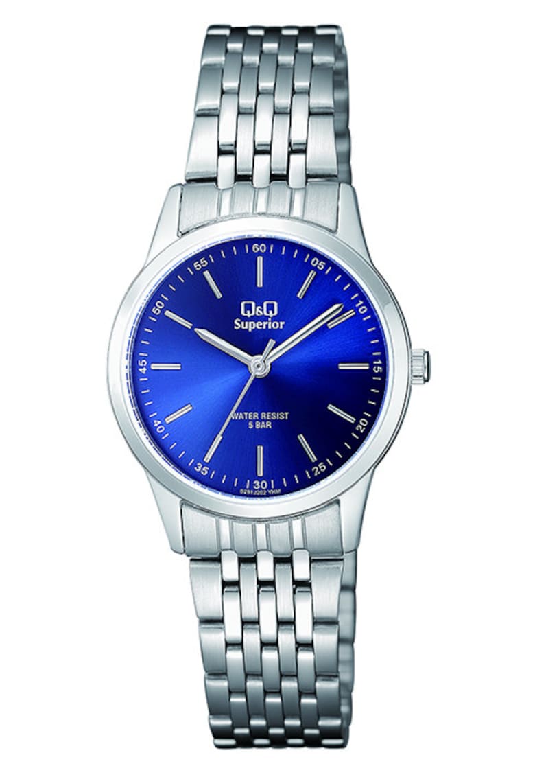 Caracteristici Tip mecanism: quartz Tip display: analog Stil: elegant Functii: secunda Sistem inchidere: catarama tip fluture Rezistenta la apa: 5 atm Greutate: 55 g Cadran Material geam: cristal mineral Culoare cadran: albastru Tip citire cadran: linii Carcasa Forma carcasa: rotunda Material carcasa: alama Culoare carcasa: argintiu Diametru carcasa: 30 mm Curea/bratara Tip: bratara Material curea/bratara: alama Culoare curea/bratara: argintiu Latime curea/bratara: 14 mm