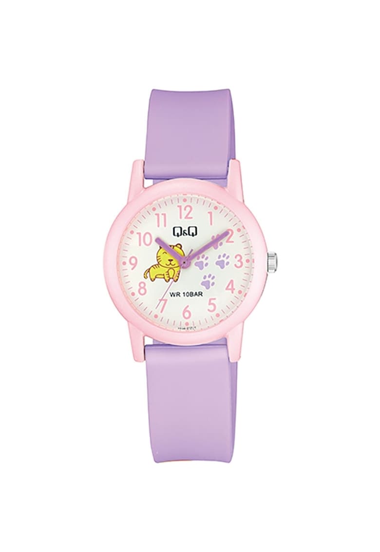 - secunda Rezistenta la apa: 10 atm Cadran Material geam: cristal mineral Culoare cadran: alb Tip citire cadran: cifre arabe Carcasa Forma carcasa: rotunda Material carcasa: plastic Culoare carcasa: roz Diametru carcasa: 32 mm Curea/bratara Tip: curea Material curea/bratara: plastic Culoare curea/bratara: violet Latime curea/bratara: 16.1 mm