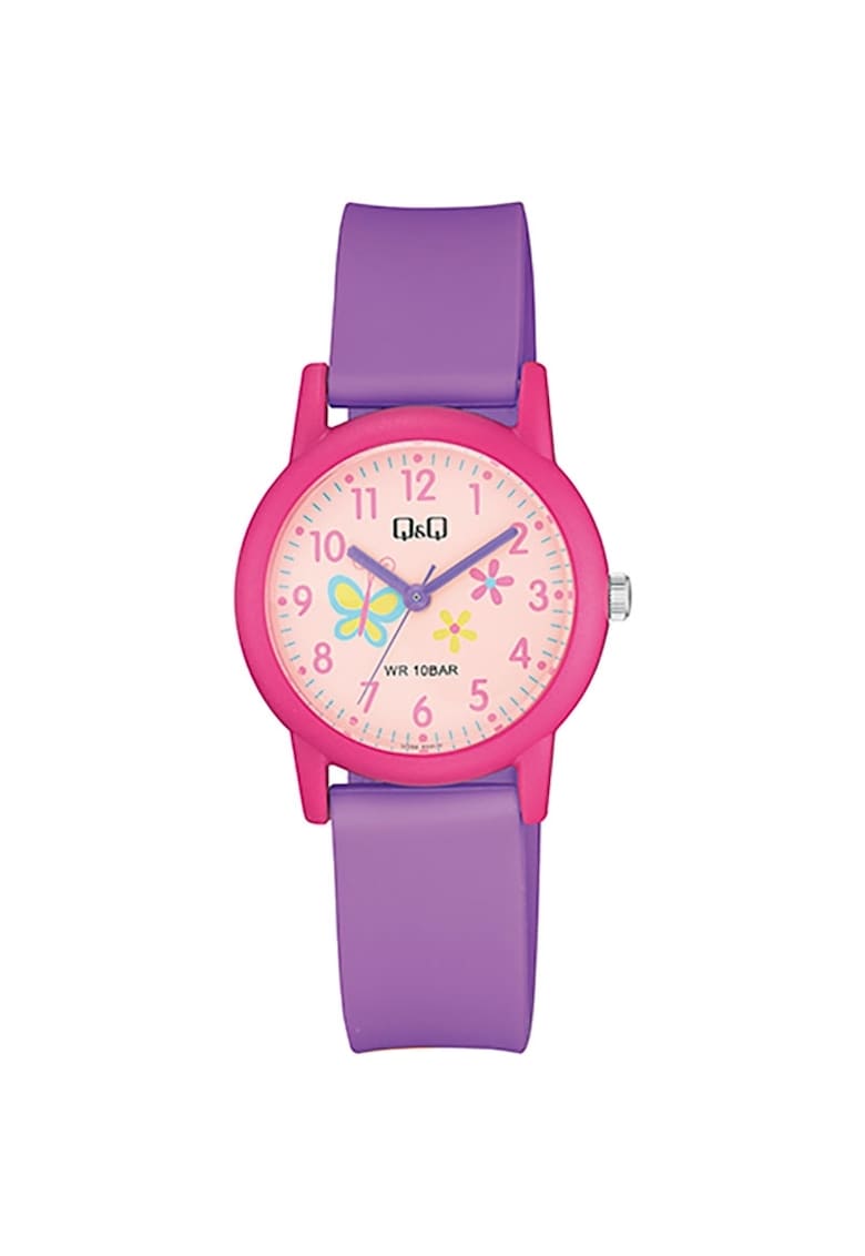 - secunda Rezistenta la apa: 10 atm Cadran Material geam: plastic Culoare cadran: roz Tip citire cadran: cifre arabe Carcasa Forma carcasa: rotunda Material carcasa: rasina Culoare carcasa: roz Diametru carcasa: 32 mm Curea/bratara Tip: curea Material curea/bratara: rasina Culoare curea/bratara: mov Latime curea/bratara: 16.1 mm