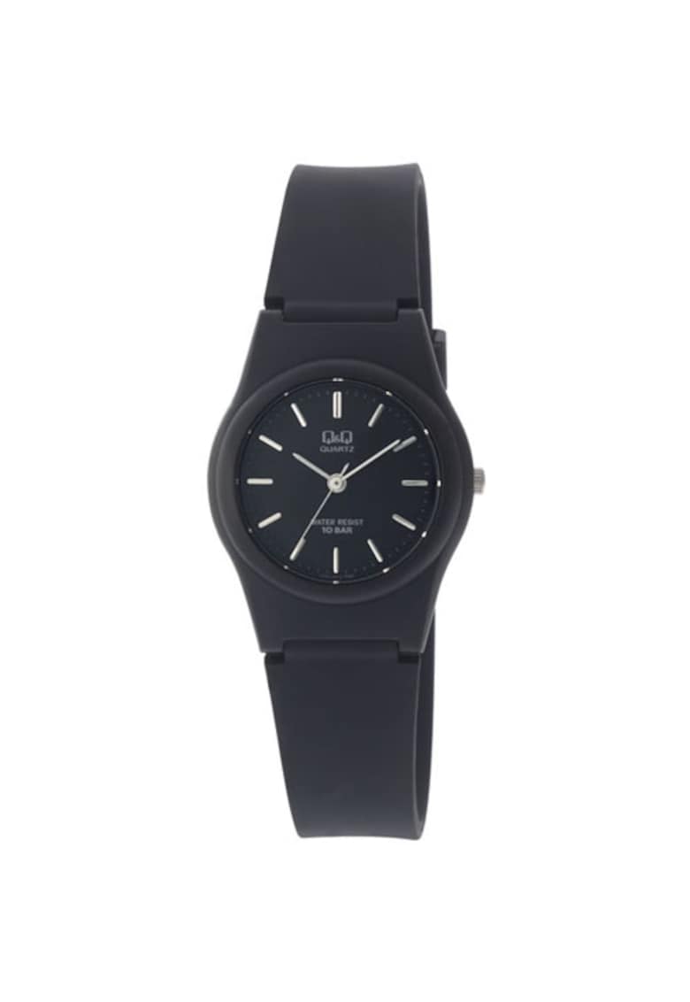 Caracteristici Tip mecanism: quartz Tip display: analog Stil: sport Functii: afisare 24 h Rezistenta la apa: 10 atm Cadran Material geam: plastic Culoare cadran: negru Tip citire cadran: linii Carcasa Forma carcasa: rotunda Material carcasa: plastic Culoare carcasa: negru Curea/bratara Tip: curea Material curea/bratara: plastic Culoare curea/bratara: negru