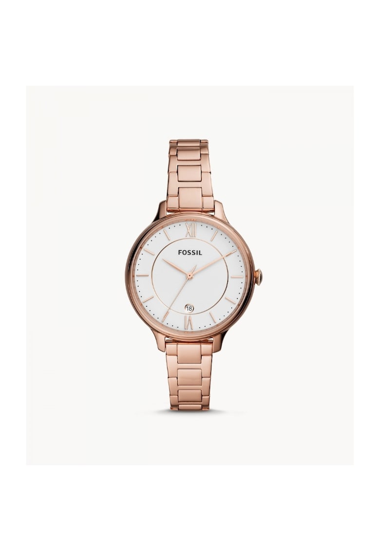 Caracteristici Tip mecanism: quartz Tip display: analog Stil: elegant Functii: afisare data Rezistenta la apa: 3 atm Cadran Material geam: cristal mineral Culoare cadran: alb Tip citire cadran: linii Carcasa Forma carcasa: rotunda Material carcasa: inox Culoare carcasa: auriu Diametru carcasa: 38 mm Curea/bratara Tip: bratara Material curea/bratara: inox Culoare curea/bratara: auriu