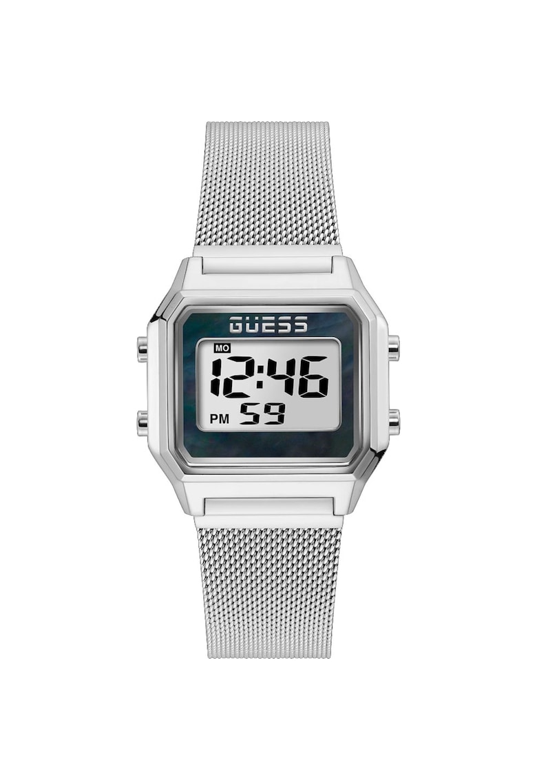 Caracteristici generale Tip mecanism: quartz Stil: casual Tip display: digital Functii: afisare data Rezistenta la apa: 5 atm Cadran Material geam: cristal mineral Culoare cadran: albastru Tip citire cadran: cifre arabe Carcasa Forma carcasa: dreptunghiulara Material carcasa: inox Culoare carcasa: argintiu Diametru carcasa: 37 mm Curea/bratara Tip: plasa Material curea/bratara: inox Culoare curea/bratara: argintiu
