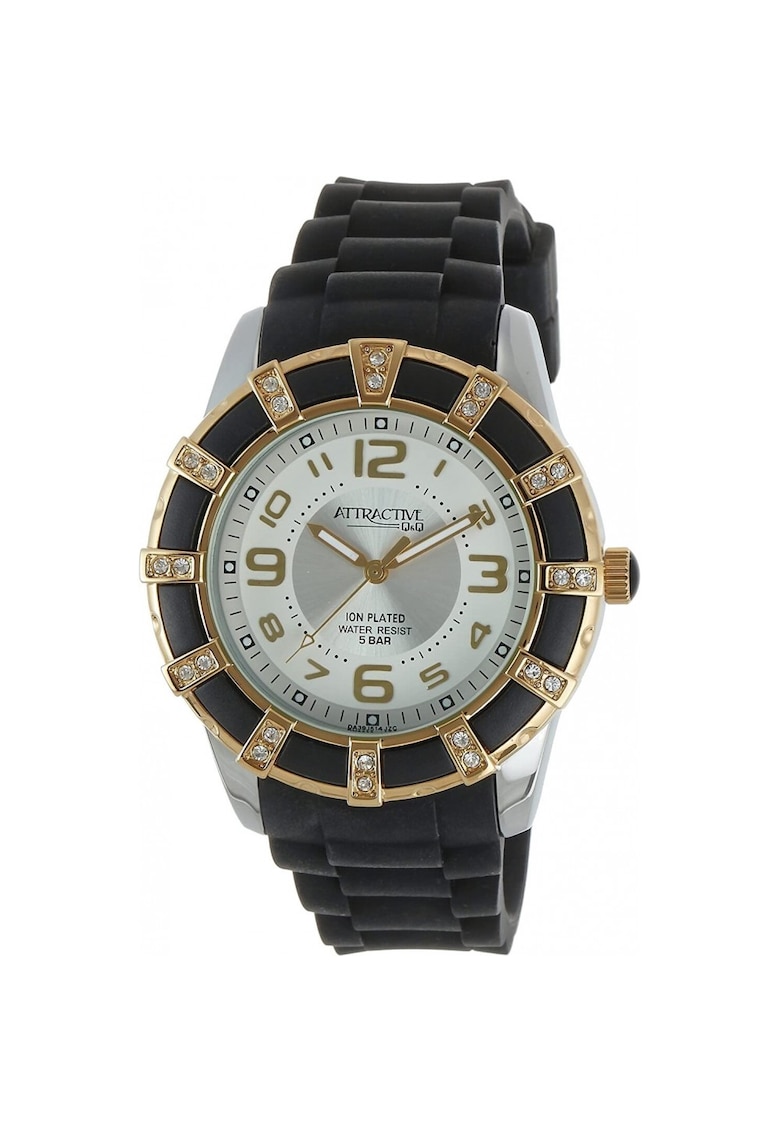 - sport Functii: minut Sistem inchidere: catarama Rezistenta la apa: 5 atm Cadran Material geam: cristal mineral Culoare cadran: argint Tip citire cadran: cifre arabe Carcasa Forma carcasa: rotunda Material carcasa: alama Culoare carcasa: auriu Diametru carcasa: 44 mm Curea/bratara Tip: bratara Material curea/bratara: cauciuc Culoare curea/bratara: negru