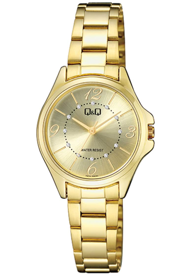 Caracteristici Tip mecanism: quartz Provenienta mecanism: japonia Tip display: analog Stil: elegant Rezistenta la apa: 3 atm Cadran Material geam: cristal mineral Culoare cadran: auriu Tip citire cadran: cifre arabe Carcasa Forma carcasa: rotunda Material carcasa: metal Culoare carcasa: auriu Curea/bratara Tip: bratara Material curea/bratara: metal Culoare curea/bratara: auriu