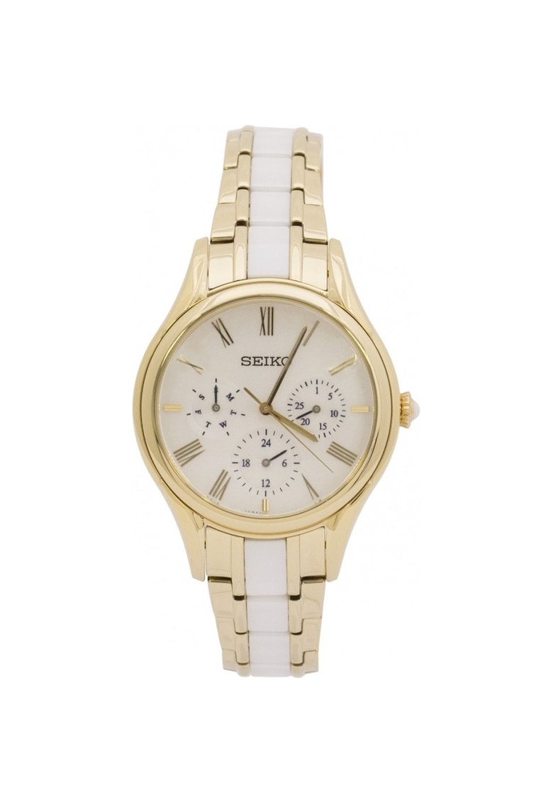Caracteristici Tip mecanism: quartz Tip display: analog Stil: casual Functii: afisare data Sistem inchidere: catarama tip fluture Rezistenta la apa: 5 atm Cadran Material geam: cristal mineral Culoare cadran: auriu Tip citire cadran: cifre romane Carcasa Forma carcasa: rotunda Material carcasa: titan Culoare carcasa: auriu Diametru carcasa: 37 mm Curea/bratara Tip: bratara Material curea/bratara: ceramica Culoare curea/bratara: auriu