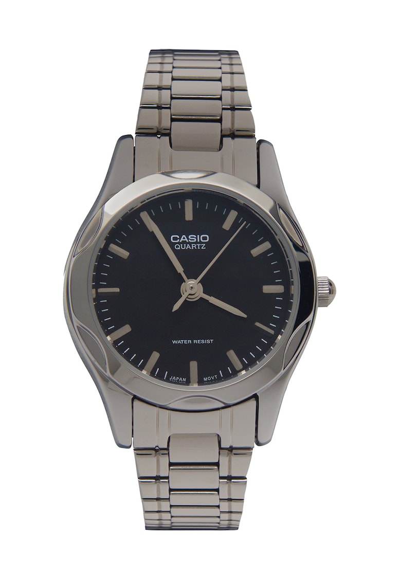 - secunda Sistem inchidere: catarama Rezistenta la apa: 3 atm Cadran Material geam: cristal mineral Culoare cadran: negru Culoare indici: argintiu Tip citire cadran: linii Carcasa Forma carcasa: rotunda Material carcasa: alama Culoare carcasa: argintiu Diametru carcasa: 25 mm Curea/bratara Tip: bratara Material curea/bratara: otel Culoare curea/bratara: argintiu