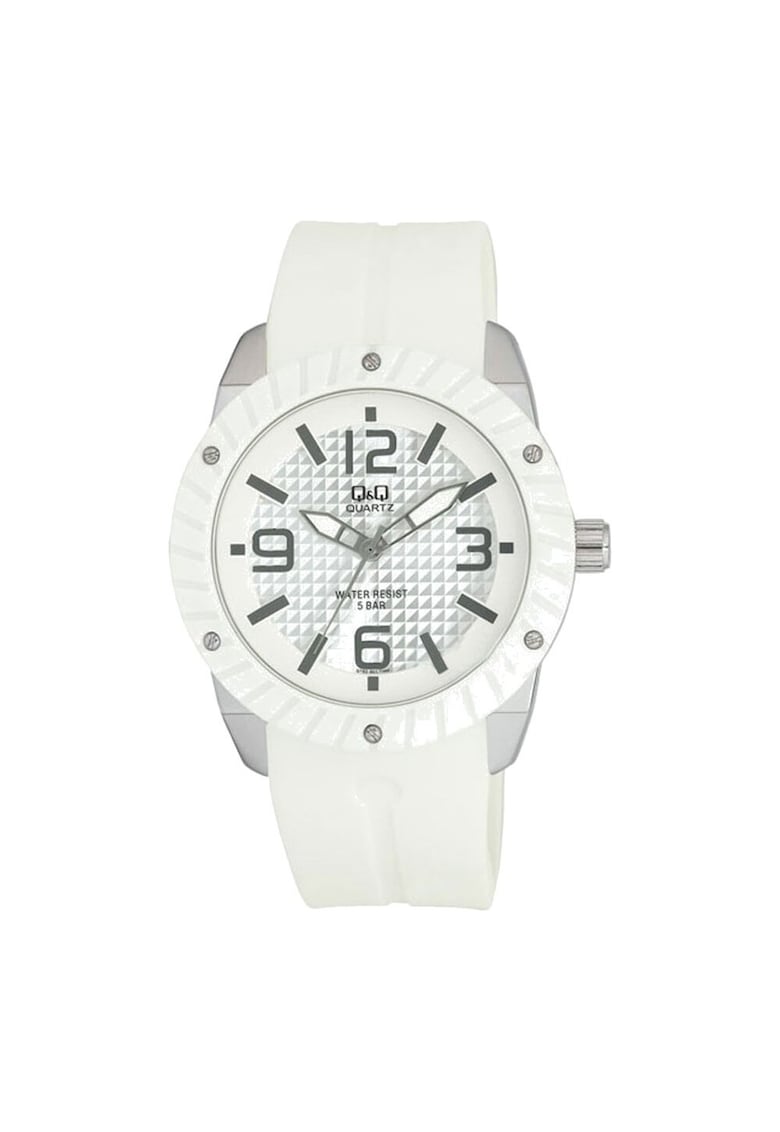 - secunda Sistem inchidere: catarama Rezistenta la apa: 3 atm Cadran Material geam: cristal mineral Culoare cadran: alb Tip citire cadran: cifre arabe Carcasa Forma carcasa: rotunda Material carcasa: alama Culoare carcasa: argintiu Diametru carcasa: 44 mm Curea/bratara Tip: bratara Material curea/bratara: silicon Culoare curea/bratara: alb